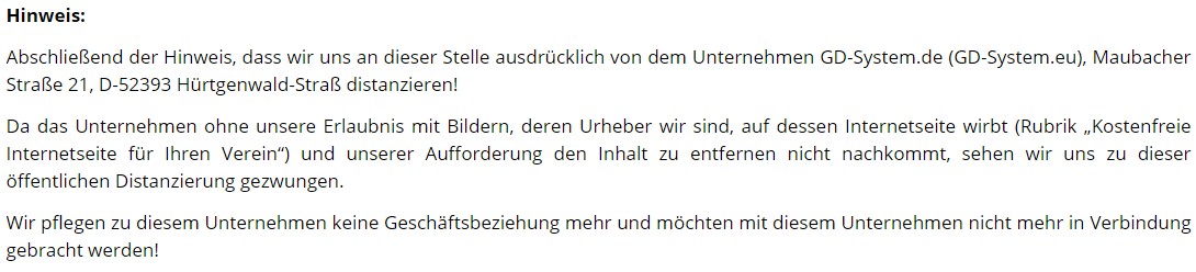 Evtl. sind Sie auf diese Seite gelangt, weil Sie einen unwahren Beitrag auf der Internetseite eines kleinen "Michael Schumacher"-Vereins (damaliger 1. Vorsitzender Reiner Ferling in Düren-Gürzenich) über uns gelesen haben - hier wird u. A. vorgeworfen, dass wir (GD-System.de) Urheberrechtsverletzungen begangen hätten - dies ist schlichtweg falsch.